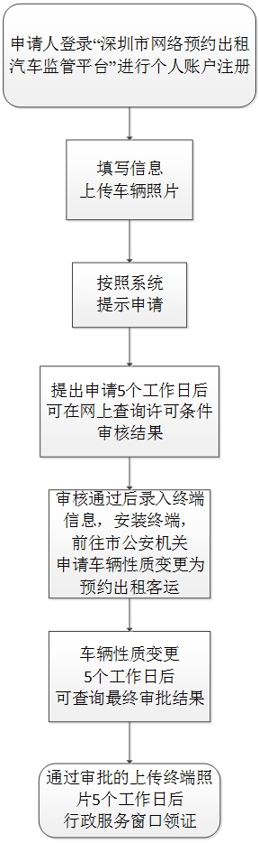 1.申请人用注册的账号登录“深圳市交通运输委员会-网络预约出租汽车服务监管平台”(网址为:http://pta.sztb.gov.cn),按照系统提示填写车辆各种信息,并上传车辆相关照片,提出申请。